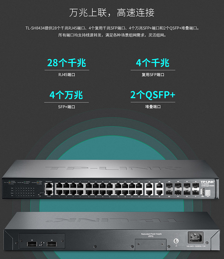 以太網(wǎng)交換機(jī)普聯(lián)/TP-LINK28千兆網(wǎng)口4光口機(jī)架式萬(wàn)兆上聯(lián)堆疊式三層網(wǎng)管交換機(jī)TL-SH8434/臺(tái)